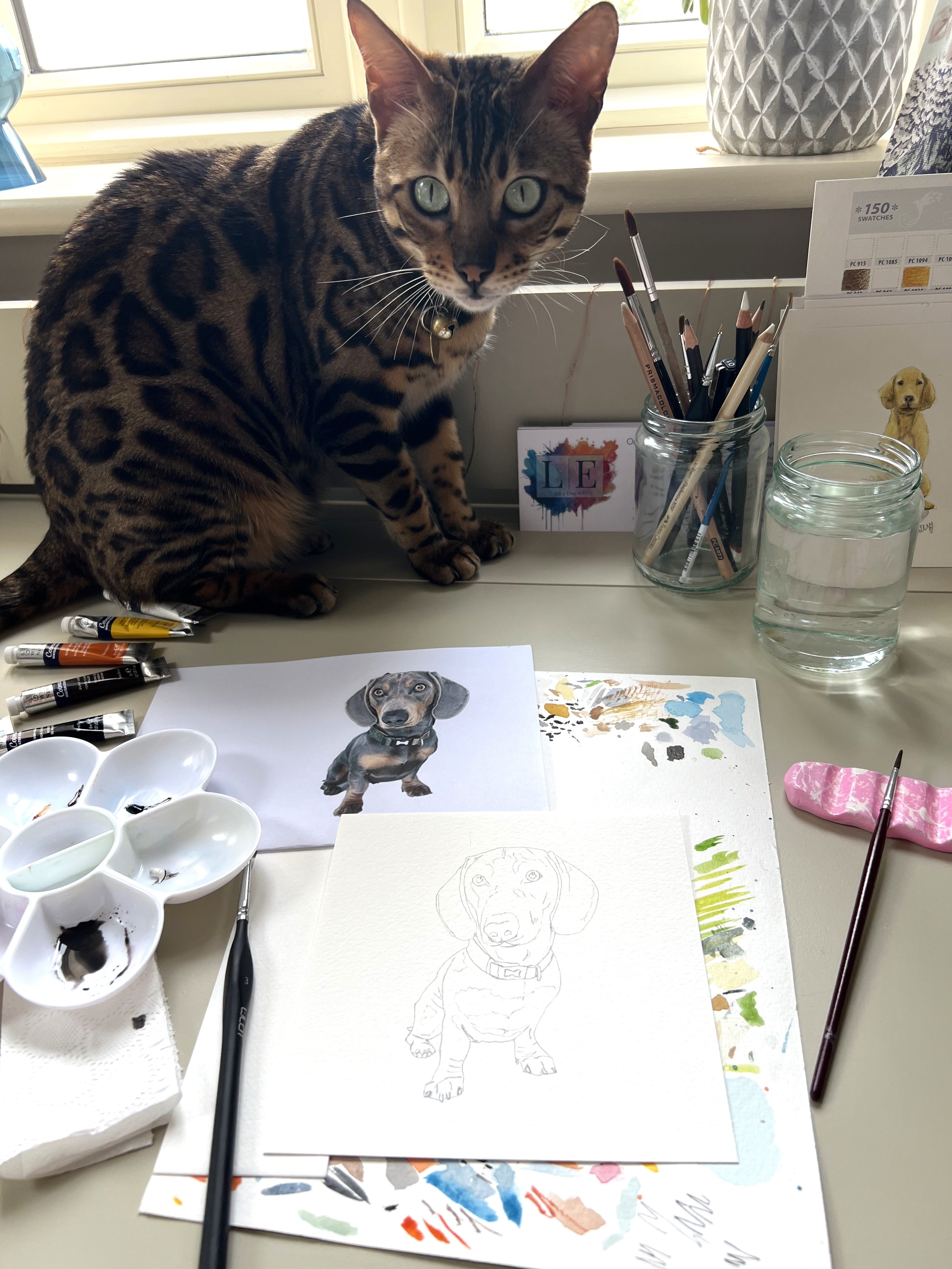 I create stunning watercolour pieces and bespoke designs to bring beauty and personality to your home. After 30 years in corporate life, I finally took the leap into my dream career as a full-time artist—starting with a Watercolour Hare, painted in my kitchen alongside my daughter. Now, with Lola the cat supervising, I craft each piece with care, creativity, and a personal touch.